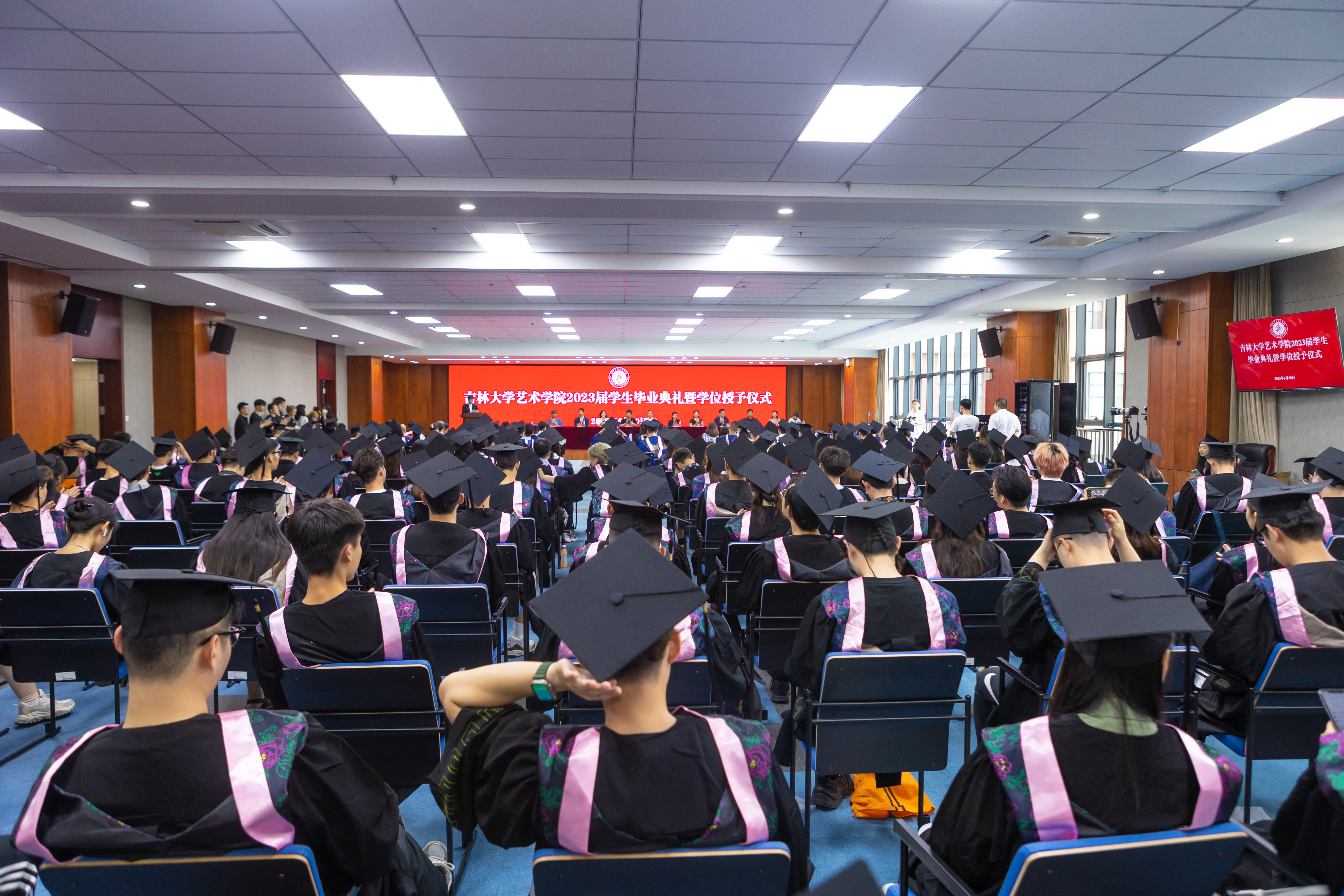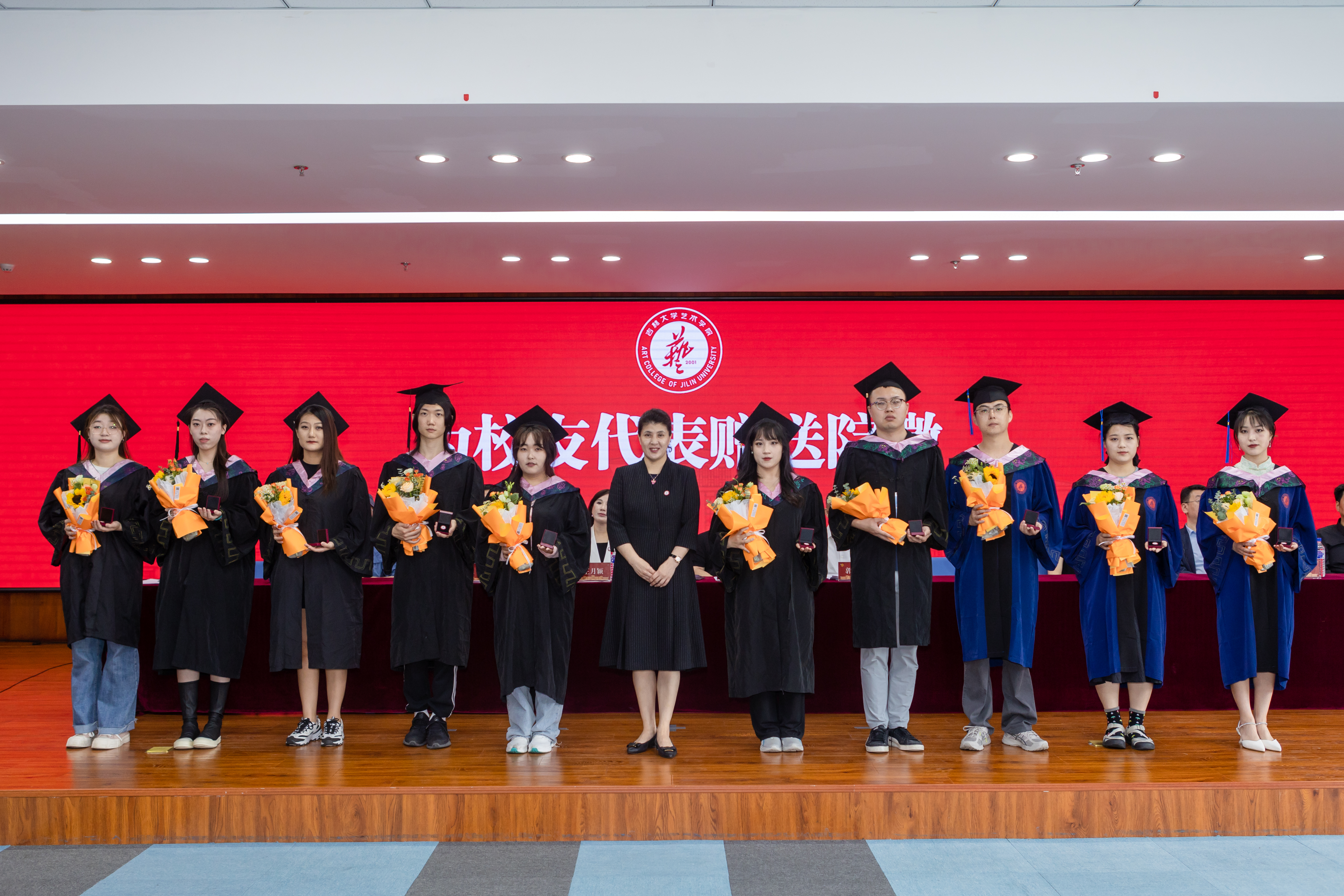 学位授予仪式上。主礼教授郭春方经理为毕业生颁发学位证书;吴向东教授、朱廷丽教授为毕业生拨动流苏;w66旗舰厅设计系、美术系、音乐系近30位导师作为主礼教授见证毕业生授予学位。仪式最后,主礼教授全体起立,一同祝福毕业生们毕业快乐,并深情寄语,希望同学们始终高扬理想信念旗帜,向下扎根,向上生长,以“求实创新,励志图强”的实际行动践行初心使命,在新时代的奋斗中释放青春激情、追逐青春理想,脚踏实地、苦练本领,用自己的双手创造属于自己的精彩人生。与会师生共同高喊“一日归属吉大,一生念念不忘”表达对老师的感恩,对母校的眷恋和对未来的信心。