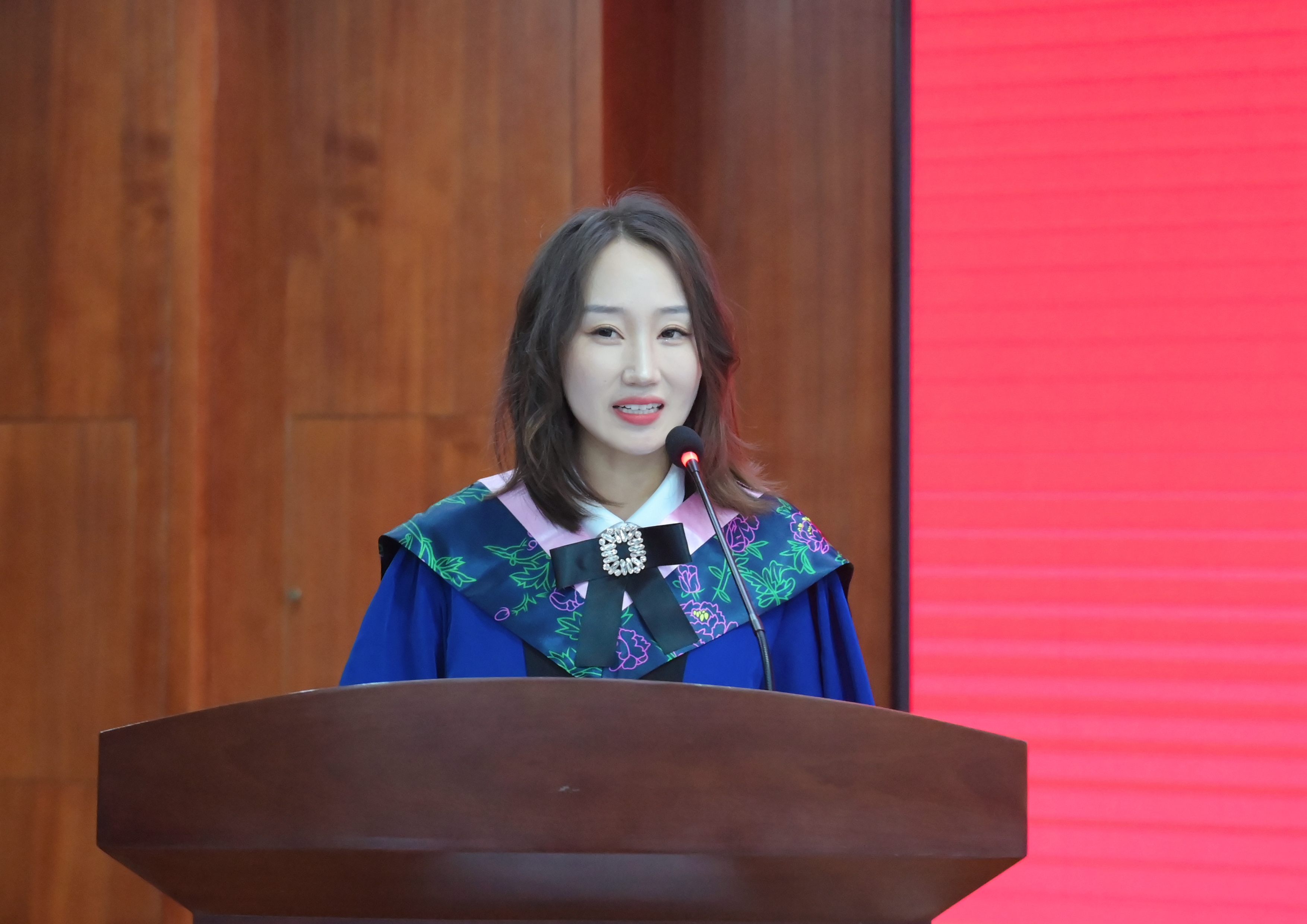 2024届毕业生代表音乐系聂俊楠同学发言,她代表公司全体毕业生向工作在一线的老师们致以最崇高的敬意。她表示,在专业领域的研究学习中,要始终保持对知识的敬畏,不断探索,在艺术的海洋中乘风破浪;要心怀家国,服务人民,用所学回馈国家和社会,承担起时代赋予的使命,在未来的征程中不断超越自我,书写更加灿烂的人生篇章。