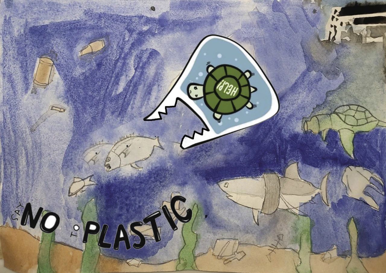 设计说明:基于保护海洋生物的主题,主要从塑料、易拉罐等垃圾对海洋生物的影响出发,辅以肆意排入大海的污水对海洋的影响,具体以被轮胎套住的鲨鱼、被水瓶套头的乌龟、如大鱼一般凶狠“吞食”海洋生物的塑料袋体现其危害,深化拒绝塑料污染的主题。