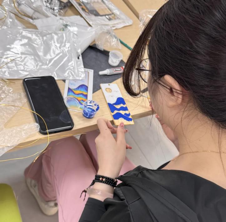 活动现场,同学们细心盘丝、点蓝、磨光,每一步都凝聚专注与创意。金丝蜿蜒,彩釉流转,原本冷硬的金属与矿物在指尖逐渐绽放出温润光泽。一枚枚独一无二的珐琅书签悄然成形,仿佛承载着秋日的诗意与青春的印记。